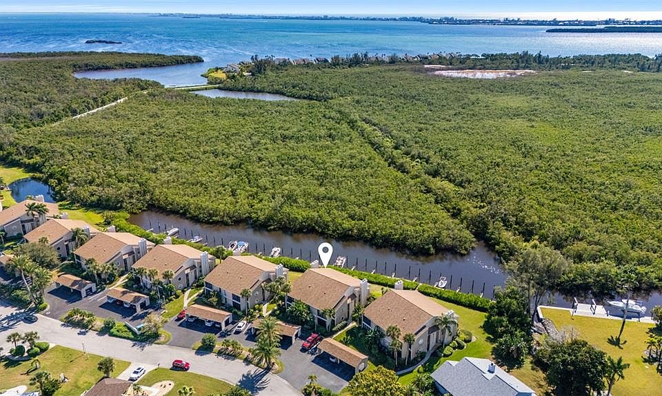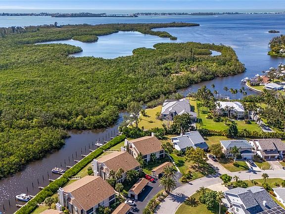 Nestled in the waterfront community of Bay Hollow, this spacious 2-bedroom, 2-bath end-unit condo offers over 1,700 sq. ft. of thoughtfully designed living space. Soaring cedar-plank ceilings, a wood-burning fireplace, and large windows fill the home with natural light and warmth. The updated kitchen features wood cabinetry, a farmhouse sink, stainless steel appliances, and a cozy spot for morning coffee or casual dining. A versatile bonus room with sliding doors and screens provides the perfect flex space for an office, art studio, or yoga retreat, while the enclosed lanai offers peaceful views of the mangrove-lined waterway. The primary suite has vaulted ceiling, walk-in closet, and ensuite bath, and the guest bedroom opens to the flex space. Step outside to your private deeded boat slip with water and electric, providing quick access to popular sandbars and waterfront restaurants or just under 10 minute drive to Anna Maria Island beaches. Additional updates include a 2.5-year-old roof, 2019 AC, new screens, washer/dryer (2021), water heater (2024), refrigerator (2015), oven (2015), microwave (2024), and dishwasher (2015). Perfect as a full-time residence or seasonal retreat, this condo offers effortless coastal living with maintenance-free convenience.
