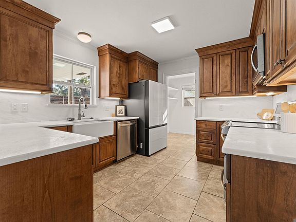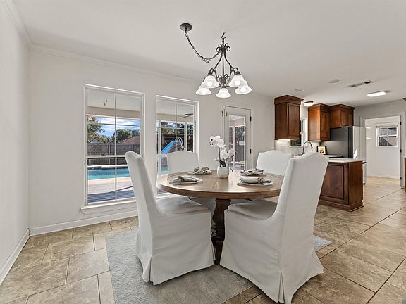 Swimming poolCovered carportCovered tiki barStainless steel appliancesWhite countertopsRich wood cabinetryVersatile layout