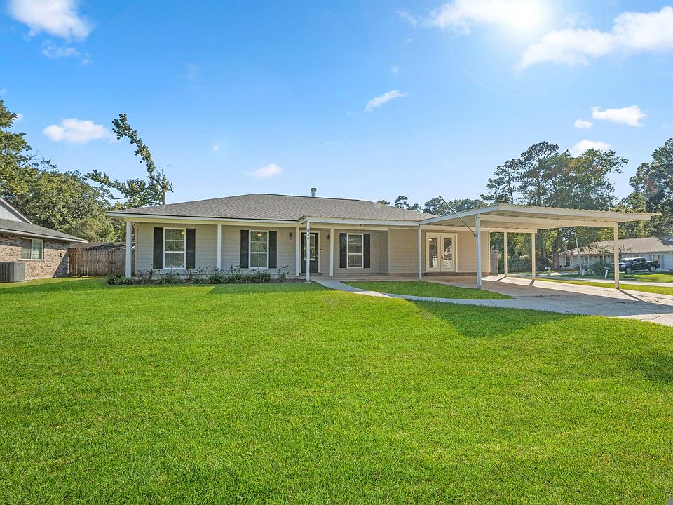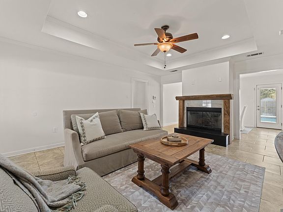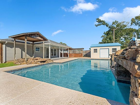 4-bedroom home located in the desirable Shadow Springs Subdivision of Denham Springs! The backyard is an entertainer's dream with a swimming pool, slide, waterfall, and a covered tiki bar. Plus an 18 x 20 storage building provides extra space. Inside, the single-story home offers a versatile layout, including two primary suites. The living room has a fireplace and opens to the dining and kitchen areas. The updated kitchen features rich wood cabinetry, white countertops, a farmhouse sink, and stainless steel appliances. Plus, a covered carport, and a 3-year-old roof.