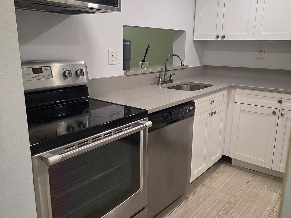 Screened balcony with storageUpdated cabinetsModern kitchenTile flooringStainless-steel appliancesSpacious unit