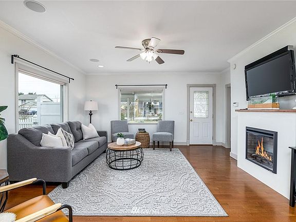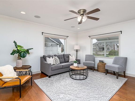 Beautifully landscaped, charming 1914 remodeled farmhouse nestled on a large fenced corner lot. This home surprises with amazing outdoor living space including covered back patio featuring hanging lights. Enjoy the expansive stamped concrete patio, fruit orchard w/plum, apple, peach & pear trees plus currents & berries. Flowers everywhere! Yard surrounded by vinyl 6ft privacy fence. Perfect for fun filled BBQ's or just quiet evenings around the firepit. Inside: You'll warm to this Charming 3bdrm/2 bath home with adorably updated Kitchen. Open floorplan with loads of natural light. Ensuite Master on the main with 2 more bedrooms upstairs. Oversize 2 car garage plus work shop &/or Rec area. Loads of parking. New roof and H/W heater. Wired for Surround Sound. Walking distance to Bernice Vossbeck Elementary School.
