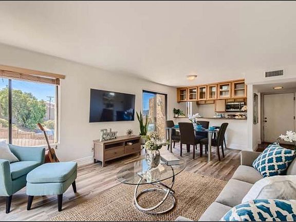 Light and bright freshly painted unit with view. New appliances and wood flooring. HUGE storage room downstairs. Washer and dryer in unit. 2 covered parking spaces and HUGE storage space. Gated community. Complex has a pool and dog area! Come check out this unit will go fast! Owner pays for water, trash and sewer
