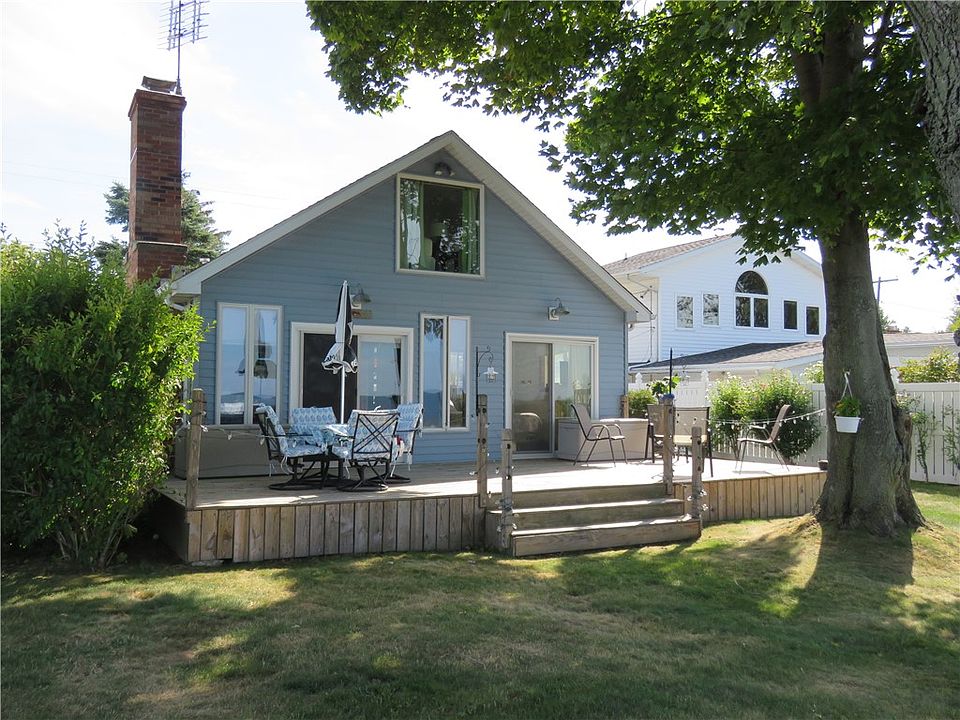 Amazing Year round Lakefront home on Lake Ontario with the most awesome sunsets and views. Your blood pressure will go down the minute you sit on your deck to relax and watch the boats and sunsets. Nothing better than lake front living. You have your own small boat ramp, great for kayaks and jet skis. Sellers had a new concrete break wall installed. many new features in the past few years include a new kitchen with soft close drawers and cabinets accented with tile back splash and Quartz counters. The kitchen includes gas stove, refrigerator, dishwasher and a stackable washer and dryer. The vaulted ceiling gives an open feel and the sliding glass doors offer a nice lake view. Cozy living room with a woodburning fireplace, spiral staircase to the open loft for a 3rd bedroom or sitting area with a large picture window over looking the lake. The bathroom has been redone with a large shower, vessel sink and cabinet. Enjoy hot water on demand, whole house generator with new electric panel, newer vinyl siding and new sliding glass doors. Sellers had Home comfort add insulation in attic and walls and insulation was added with vinyl siding. Square footage came from a bank appraisal.