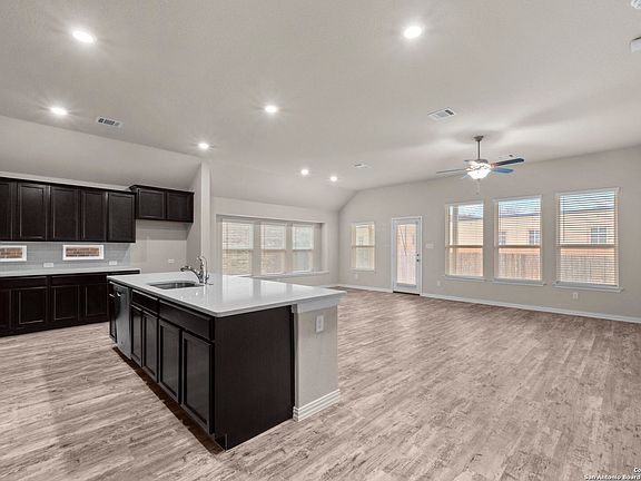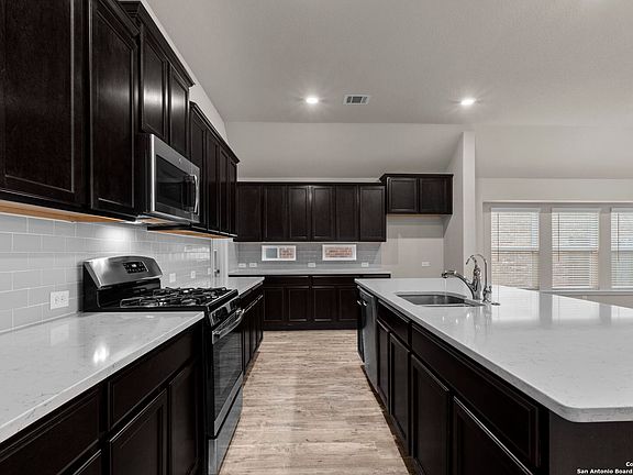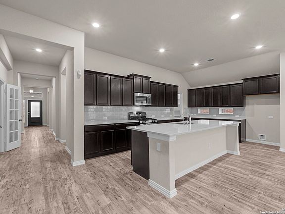 Welcome to your ideal home featuring one story, 4 generous bedrooms and 3 full baths, complemented by a dedicated home office with charming French doors. As you step inside, you'll be greeted by a stunning display of craftsmanship, highlighted by soaring 10ft ceilings and a spacious open floor plan, complete with a water softener for your comfort. The kitchen is truly a chef's dream, featuring an expansive 10-foot island, ample storage with plentiful cabinets, a gas range, and stainless-steel appliances. The thoughtfully designed split primary suite offers a relaxing oasis with a luxurious walk-in shower and double vanity. Enjoy privacy in your backyard, which is fully fenced and includes a covered patio, perfect for outdoor gatherings. Situated in the highly sought-after Kallison Ranch community with an array of amenities, including two pools, a pavilion with a fireplace, a playground, and a dog park, this home is part of the esteemed Northside Independent School District (NISD) and is conveniently located just 30 minutes from Lackland Air Force Base. With easy access to highways 211 and 1604, commuting is effortless, and you'll have the opportunity to explore all the area has to offer. Don't miss out on the chance to own this remarkable property!