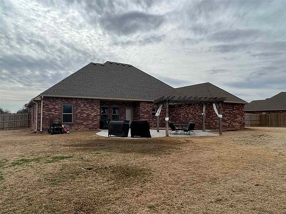 Welcome to this stunning 5-year-old brick home, where modern design meets traditional elegance. As you enter the home, you'll be immediately struck by the spacious and open floor plan, perfect for entertaining and comfortable living. The gourmet kitchen is the heart of this home, featuring a large center island with ample seating for casual dining or entertaining. The island provides a focal point for the kitchen, with plenty of counter space for meal prep and serving. The stainless steel appliances, including a cooktop with a pot filler, built in oven and microwave, are a chef's dream, making meal preparation a breeze. Step outside onto the back patio complete with a pergola, which provides the perfect setting for outdoor entertaining or relaxing. The pergola offers shade from the sun, and the patio is the ideal spot for al fresco dining or enjoying a morning cup of coffee. In addition to the outdoor living space, this home also features a storm shelter, providing peace of mind during inclement weather. The 3-car garage provides plenty of space for vehicles and storage, making it easy to keep everything organized and tidy. The master suite is a luxurious retreat, featuring a spacious bedroom with tray ceilings. The ensuite bathroom features a double vanity, a whirlpool tub, and a walk-in shower, providing the ultimate in relaxation and comfort. The master closet provides ample space for clothing and storage, making it easy to keep everything organized and accessible. Three additional bedrooms and a full bathroom round out this beautiful home, providing plenty of space for guests or family members. With its modern design, comfortable living spaces, and outdoor amenities, this 5-year-old brick home is the perfect place to call home.