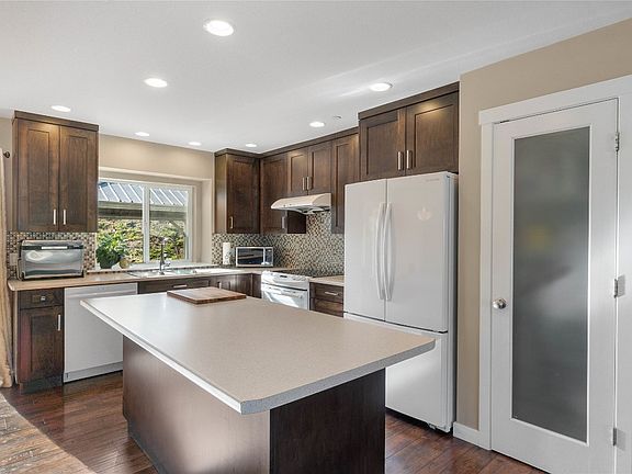 Beautiful family home with great street appeal, xeriscaped front yard & generous 3 car wide driveway for your RV or boat with easy care manual UG sprinklers for the front plantings. Welcoming foyer with front bedroom/office and access to the oversized, heated double garage with tandem bay for a 3rd vehicle or workshop. Upper level features engineered hardwood floors, open concept living with island kitchen with appliances included & lots of cabinets for storage. Spacious living room has gas fireplace & stunning river and mountain vineyard views. Dining area with built-in buffet opens to a private fenced yard with negotiable gazebo — perfect for kids & pets. Three bedrooms up including a spacious primary with 4pc ensuite, double sinks & large shower. Entry level offers a bright bachelor in-law suite with Murphy bed, private entrance & full kitchen with all appliances and full bath — ideal mortgage helper or guest space. New hot water tank, in-house sprinkler system, well maintained & serviced furnace & A/C. Backs onto greenspace with trails & close to neighborhood park — the perfect home for a growing family!