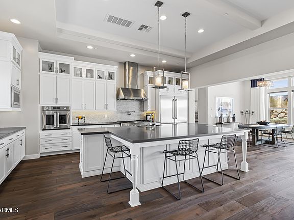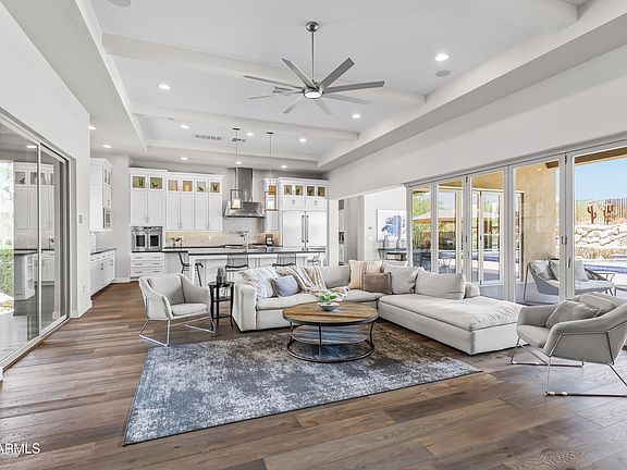 Stunning former model home with builder upgrades in Copper Sky! This modern single-level residence offers premium finishes and a sophisticated open split floor plan. Includes 3 spacious bedrooms, 3.5 baths, and a 3-car garage with detached single bay. The Chef's kitchen features high-end stainless-steel appliances, multiple ovens, oversized island, custom ceiling-to-floor cabinetry, back kitchen, walk-in pantry, and formal dining areas indoors and out. The great room showcases cornerless bifolding doors, wood floors, a wet bar, and Sonos surround sound—perfect for Arizona's indoor/outdoor lifestyle. Enjoy mountain sunsets from the resort-style backyard with heated pool, Sundance spa, fire pit, cedar canopy, built-in BBQ, full poolside bath, artificial turf, and lush landscaping. The luxurious primary suite offers backyard access, private den, spa-style bath, and custom walk-in closet with direct laundry access. Move-in ready and impeccably maintainedScottsdale living at its finest!