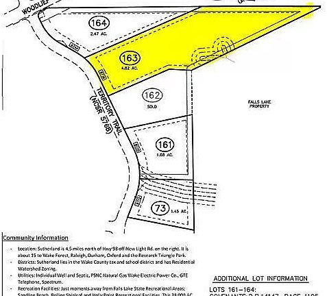 EXQUISITE & SPRAWLING 4.82 acre lot now available in the highly desireable Sutherland subdivision! Location, Location, Location..Sutherland neighborhood is 10 minutes to 540, minutes to Falls Lake, dining, shopping and more. Come build your dream home and make Sutherland subdivsion your next home! More infomation coming.