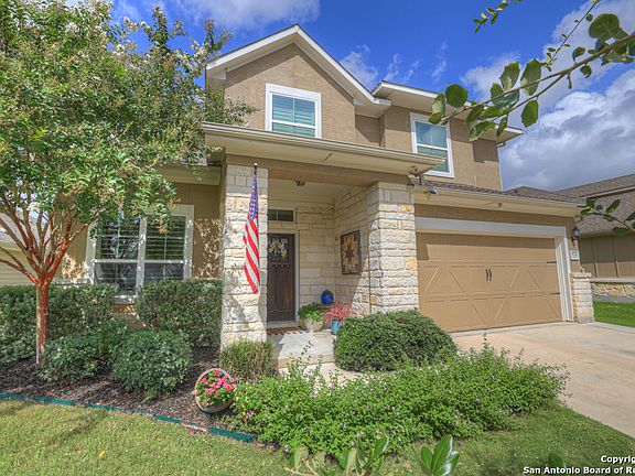 Nestled within the exclusive Crossvine community, this well maintained residence boasts an open-concept design, featuring soaring 20-foot ceilings in the family room, beautifully accentuated by a striking stone fireplace. The kitchen is both stylish and functional, with granite countertops, stainless steel appliances, a gas stove, and a generously sized island that seamlessly flows into the living area, making it an ideal space for entertaining. The main level is home to a spacious owner's suite, offering ultimate comfort with a spa-like bath, a walk-in shower, and an expansive closet. A dedicated home office, with a custom barn door entrance, provides the perfect balance of privacy and style for work or study. Additionally, a well-appointed mud room ensures convenience and organization upon entering the home. Upstairs, three generously proportioned bedrooms and a versatile game room await. Throughout the home, custom plantation shutters add a touch of refined elegance, complementing the home's timeless design. Step outside to an entertainer's paradise, where an extended covered patio includes a fully equipped outdoor kitchen-complete with a gas grill, sink, and built-in cooler. Enhanced landscaping ensures privacy, while a covered pergola and remote-controlled sunshades elevate the outdoor experience. As a resident of Crossvine, you'll enjoy access to an array of world-class amenities, including a resort-style pool, a sophisticated events pavilion, and a multipurpose outdoor amphitheater. The community also features a meticulously planned hike and bike trail system, community greenbelts & open fields, and serene pocket parks. For fitness and wellness enthusiasts, there is an exercise course and multiple tranquil ponds & water features. Residents also have the pleasure of enjoying lending libraries and easy access to the City of Schertz Heritage Oaks Park. The future Town Center will offer even more convenience and luxury. This master-planned community is ideally located near schools, as well as premier shopping, dining, entertainment, and Randolph Air Force Base-making it the ultimate blend of sophistication and convenience.