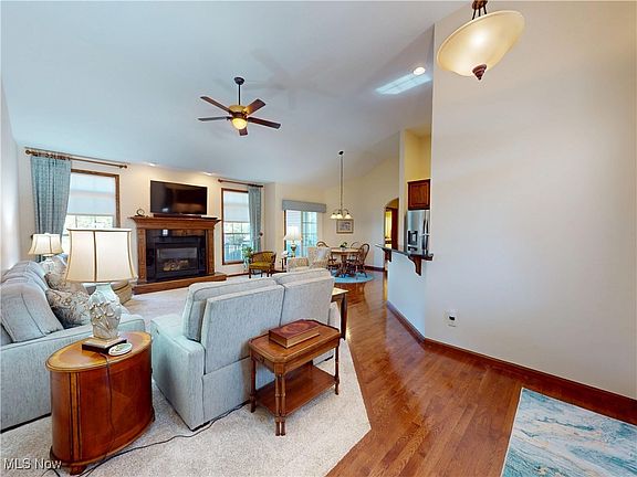 This beautiful home features an open-concept design with vaulted ceilings and a spacious foyer that opens to a bright living room. Large windows fill the space with natural light, while the gas fireplace adds a warm and inviting ambiance.