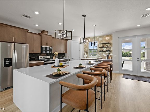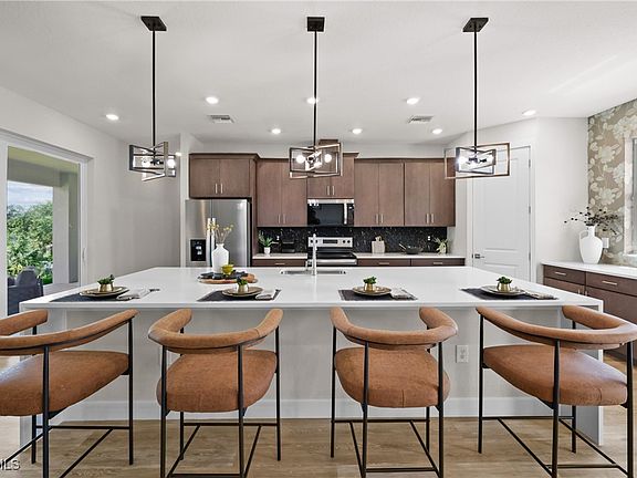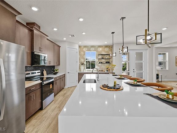 At the heart of the home, the gourmet kitchen showcases quartz countertops, stainless steel appliances, a walk-in pantry, tile backsplash, and a large island perfect for gatherings. The open-concept great room is equally impressive, featuring a sleek electric fireplace and a full wet bar with beverage refrigerator-ideal for entertaining with style. Additional highlights include coffered ceilings, 8-foot interior doors, 9-foot garage doors, a paver driveway, entry, and lanai, plus designer lighting throughout.