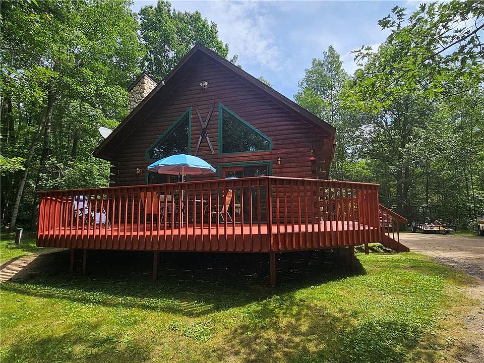 Beautiful Chalet log home with a great Northwoods appeal. Open floor plan, main level has 2 beds 1 full bath as well as a huge loft bedroom. Full unfinished basement that has poured wall foundation. Wood burning fireplace. Forced Air furnace. Nice partial wrap around deck that has been freshly painted. Plenty of room for that huge toy shed or a detached or attached garage. Most furnishings are included. 1 mile away in either direction to a boat launch area. This property has been removed from the condo association. New A/C unit being installed.