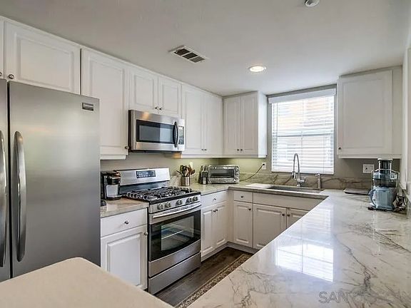 This beautifully upgraded Ocean View Hills home is a rare find in this highly sought-after, resort style, gated community. Situated perfectly, this home enjoys south-western exposure, flooding every room with natural light. The kitchen features granite counters, modern white cabinets and stainless steel appliances. Granite countertops and modern double sinks in the master bath, along with a spacious walk-in closet and in unit laundry add convenience and luxury. Enjoy central air conditioning and more! The open floorplan with soaring ceilings and crown molding creates an inviting space, perfect for entertaining, while the outdoor patio offers a peaceful view of the surrounding trees. The attached garage provides direct access to the home, plus an additional assigned parking space right outside. The community offers a resort-style pool and spa, playground, plus a BBQ area perfect for gatherings. Conveniently located near the 805 and 905 freeways, Kaiser Permanente Medical Center, shopping, AMC Palm Promenade, schools, Sleep Train Amphitheater, and just minutes from Imperial Beach, Coronado Naval Base, and 32nd St Naval Base.