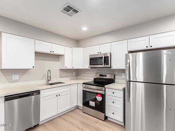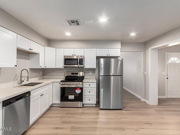 Low maintenance front yardRecessed lightingWalk-in pantrySs appliancesShaker cabinetsCarpeted arizona roomQuartz countertops