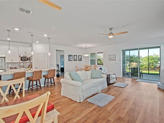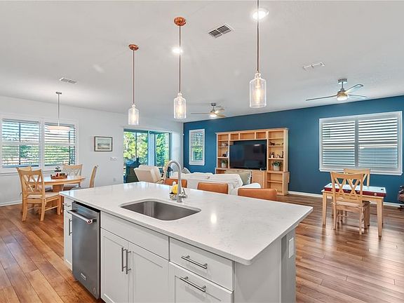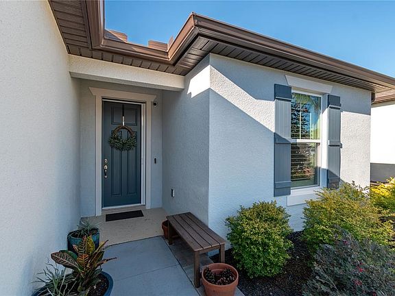 Expanded Mystique model is awaiting your next chapter in comfort and style. Located in the gated, sought-after active 55 + community of Stone Creek Golf Course Community. This move-in ready home is designed for comfort and class. The home features a a third bedroom and an additional flex room. Luxury Vinyl and tile is tastefully thought out throughout the home, complemented by Plantation shutters. The extended birdcage lanai overlooks a fenced back yard with a private feel and a relaxing hot tub. Open floor plan, high ceilings and custom backsplash make this home stand out. Owners suite offers a spacious walk in closet, private bath featuring a Roman-style walk in shower, dual sink vanity, chic glass tile inlay and a transom window for added light. Oversized laundry room and folding table with plenty of storage. The garage, has an additional four feet for tools, bikes or golf cart. Modern Smart Home technology already built in so you can enjoy a connected, convenient lifestyle. Stone Creek is packed with amenities that elevate everyday living. Resort style pools, health spas, live entertainment, tournaments, and curated trips. Owner is including the golf cart with purchase of home.