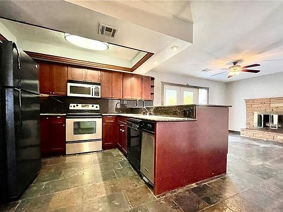 Rv parkingSingle-story homeKitchen with granite countersPlenty of cabinet spaceCozy fireplace