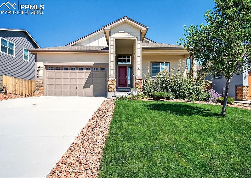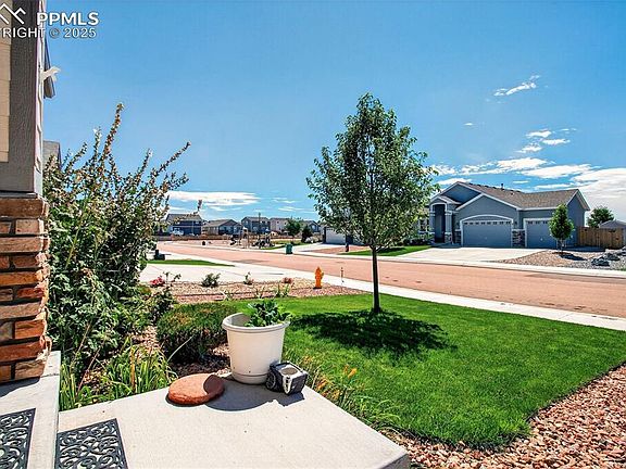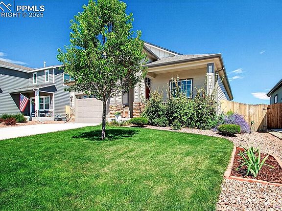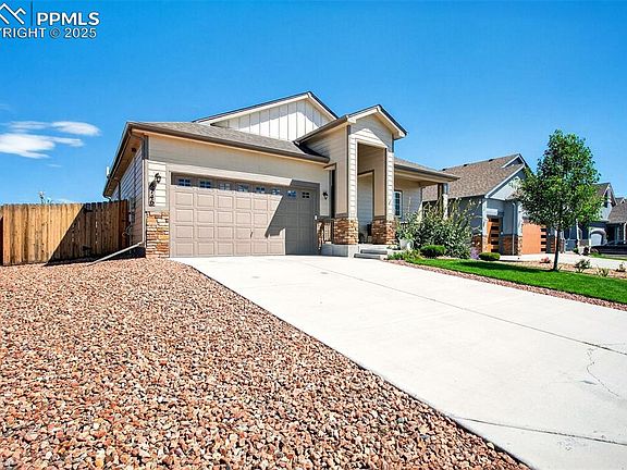 WELCOME HOME to this show-stopping 5 bed, 3 bath rancher in the sought-after Glen at Widefield. Built in 2021, this home isn’t just move-in ready, it’s been thoughtfully upgraded inside and out to give you the lifestyle you’ve been dreaming of. From the moment you arrive, the curb appeal speaks for itself: fresh custom landscaping, charming covered front porch, and a backyard designed for both relaxation and adventure. Step through your private back gate and you’re instantly greeted with trails and open space with sweeping mountain views. Inside, the bright open-concept floor plan and Pikes Peak views from nearly every window will steal your heart. The chef’s kitchen is the centerpiece, with a massive island, gas stove, stainless steel appliances, and elegant granite counters that make cooking and entertaining a breeze. The spacious main level includes a sunlit living room, dining area with walk-out access, and a luxurious primary suite featuring a spa-worthy 5-piece bath and walk-in closet. The finished basement offers endless possibilities — from a rec room to a home theater to the ultimate entertaining space with wet bar/kitchenette hookups already in place. Imagine hosting family gatherings, game nights, or movie marathons in your private retreat. Two beds and a full bath grace the bottom level keeping guest privacy top of mind. Step outside to a backyard oasis: custom rock fire pit, two storage sheds for all your gear, hot tub hookups ready for relaxation, and space that feels both private and expansive. Smart-home conveniences include Ring doorbell, Ecobee smart thermostat, and paid-off solar panels for energy savings. Every detail has been thought of — soaring ceilings, main-level laundry, auto sprinklers, central A/C, and so much more. All of this, plus a quiet cul-de-sac location, just minutes from schools, parks, shopping, and military bases. This home isn’t just a place to live — it’s a lifestyle upgrade. Why settle for ordinary when you can have it all?