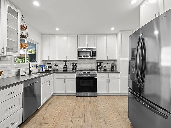 The main living area flows effortlessly into the dining and chef's kitchen, which includes brand new stainless steel appliances, beautiful quartz counters, white shakers cabinets with a soft close feature, recess lighting throughout, french doors that lead to a stunning outdoor covered patio where entertaining and dining alfresco is enjoyed.