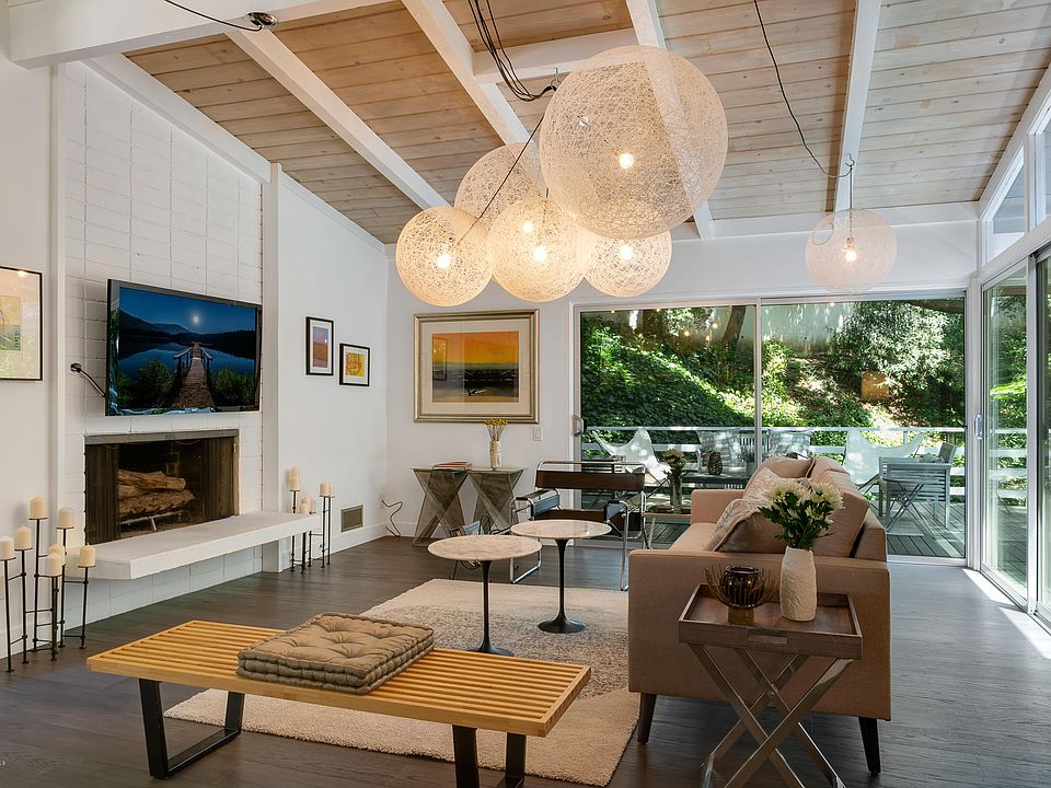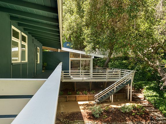 This magical Mid-Century Modern house offers a blend of art, brilliant architecture, and unparalleled sophistication. Floating effortlessly above a natural creek, the distinguished residence is gently nestled in a verdant natural setting. The transition of space from outside to inside virtually disappears in the open architecture.Sliding glass doors lead to decks, terraces and pathways to the spring. The step-down living room with beamed-vaulted ceiling and fireplace embraces the tranquil atmosphere. The modern updated kitchen with stainless steel appliances and dining area open to a quaint yard/dining patio. Three amply sized bedrooms, including a master suite each have vaulted ceilings, and enjoy outdoor deck access and gorgeous views.This paradise on earth in the very sought after San Rafael area, is in great condition.