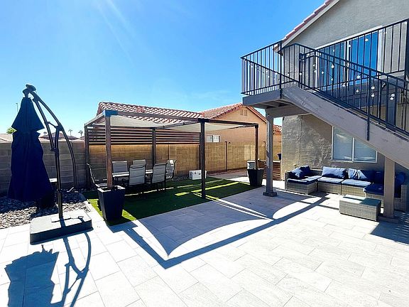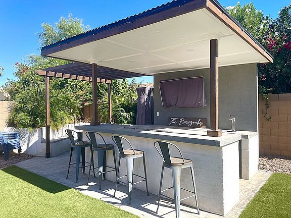 The backyard is the real standout. There’s a newly resurfaced Pebble Tec pool, a tile patio, and a pergola decked out with a built-in kegerator, mini fridge, fire table, and misters—perfect for relaxing or hosting friends. Drip lines keep the plants happy with minimal work.