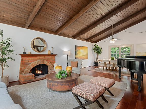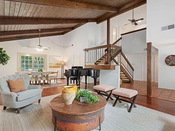 This 5 bedroom, 4 bath home is located on one of the best streets in the Mountain View attendance area. It sits on a quiet cul-de-sac overlooking a beautiful wooded greenbelt. Currently it is set up with 4 bedrooms & 2.5 bathrooms in the main house and the downstairs primary is set up as separate 1 bedroom guest quarters with full bathroom and private exterior entrance. It could easily be converted back to a downstairs primary. Gorgeous open beamed ceilings in the living and dining rooms, rich wood floors, updated windows, new paint inside and some outside, large private backyard, spacious laundry area, and attached two-car garage with lots of storage. Very rare for a home to become available in this A+ location!