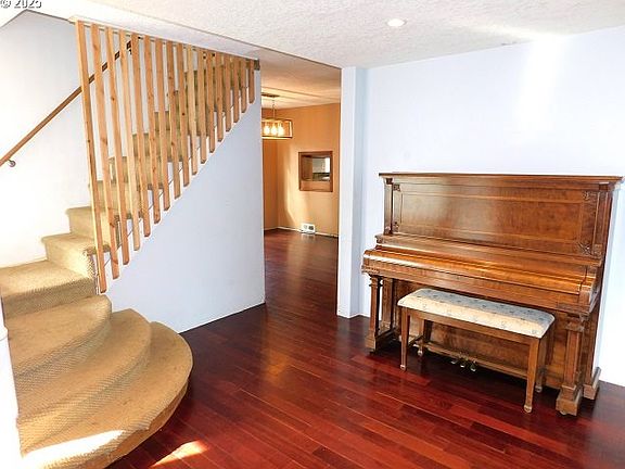 Step into the welcoming entryway, where gleaming hardwood floors and an elegant piano set a sophisticated tone. The expansive main floor features a stunning kitchen adorned with rich hardwood flooring, luxurious granite countertops, a spacious island, top-of-the-line stainless steel appliances, and a generous walk-in pantry. The primary bedroom boasts soaring ceilings and direct access to a beautifully appointed Jack and Jill bathroom, complete with tiled floors and a double vanity. The laundry room also has tile flooring, and the included washer and dryer add convenience. Enjoy formal meals in the sunlit dining room with its classic hardwood floors. The large living room offers a cozy fireplace insert, perfect for relaxing evenings. On the main level, you’ll also find a versatile small bedroom or office space with an adjacent half bath, ideal for guests or remote work. Upstairs, discover three inviting bedrooms with vaulted ceilings, a central bathroom, plus a spacious family room offering ample storage. The unfinished basement provides approximately 1,358 square feet of flexible storage or future expansion. An oversized, heated garage features high ceilings and abundant storage solutions. Additional highlights include central air conditioning, a tankless gas hot water heater, and a humidity-controlled gas furnace for year-round comfort. The generous 0.51-acre lot presents plenty of outdoor space to enjoy, along with picturesque views of Rock Creek, making this home a true retreat.
