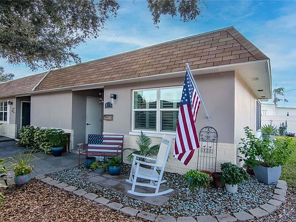 Welcome to Skye Loch Villas in the heart of Dunedin. This bright and beautifully remodeled end-unit villa offers one bedroom, one bath, and a spacious 200 sq. ft. fully enclosed lanai, the true highlight of the home. With floor-to-ceiling sliding windows, custom room-darkening shades, and tile flooring, this versatile space is perfect for morning coffee, relaxing afternoons, or evening gatherings while enjoying the Florida breeze. Inside, you’ll find thoughtful updates throughout, including tile floors, granite countertops, new kitchen cabinetry (2025), plantation shutters on all windows, and stainless steel appliances. The kitchen also features a farmhouse sink and a new refrigerator. The open, eat-in layout connects easily to the living area, where large windows provide serene views of the Skye Loch pond. Additional recent upgrades include a foam roof, energy-efficient windows, a 2-ton A/C system, and updated plumbing and electrical (2021), giving you peace of mind for years to come. The villa also includes a convenient stackable washer and dryer hookup. Set within a friendly 55+ community, residents enjoy access to a heated pool, clubhouse with kitchen, library, shuffleboard courts, and regular social events. The low $300 monthly HOA covers water, sewer, trash, premiere spectrum cable and internet, lawn care, and exterior paint, offering truly maintenance-free living. Located walking distance to downtown Dunedin’s Main Street, you can enjoy dining, shopping, and breathtaking sunsets at the marina or along the scenic Gulf trail. Just minutes from Honeymoon Island, Clearwater Beach, and the Pinellas Trail, this move-in-ready villa combines comfort, quality, and an unbeatable lifestyle.