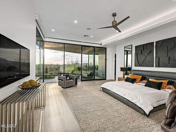 Modern luxury and integrated technology define this newly completed residence, designed by renowned architect Marc Soloway with interiors by Designs by Priya. Located in Stone Canyon's premier guard-gated community, the property offers mountain views, unobstructed sunsets, and backs to preserved desert for privacy. A pivot front door opens to a streamlined floor plan with tall ceilings, 24x48 Italian tile, and a full glass wall overlooking the resort-style backyard. Western multi-slide doors create a true indoor-outdoor layout. The kitchen features a quartz waterfall island, Sub-Zero, Wolf, and Dacor appliances, a built-in Wolf coffee maker, dual sinks, a hidden walk-in pantry, white-oak accents, and a Sub-Zero wine column. The primary suite includes floor-to-ceiling glass, a spa-inspired bath with black lavastone shower tile, floating vanities with LED mirrors, and a California Closets wardrobe. Secondary baths continue the same elevated detailing with floating vanities and full-height tile. The home is fully automated with a Control4 system managing audio, cameras, automatic shades, the cinema room, lighting, and more. Hallway lighting is upgraded to gallery-style fixtures. The cinema room includes built-in surround sound, an automatic projector, blackout shades, and a dedicated IT closet. Outdoor features include a saltwater pool and spa, view fencing, bar seating, and a Lynx Sedona grill. A custom metal spiral staircase leads to the rooftop deck for star-gazing, city light views, and sunset watching. A modern, well-built home with high-level finishes and a prime Stone Canyon setting.