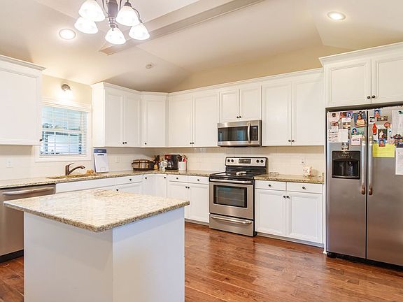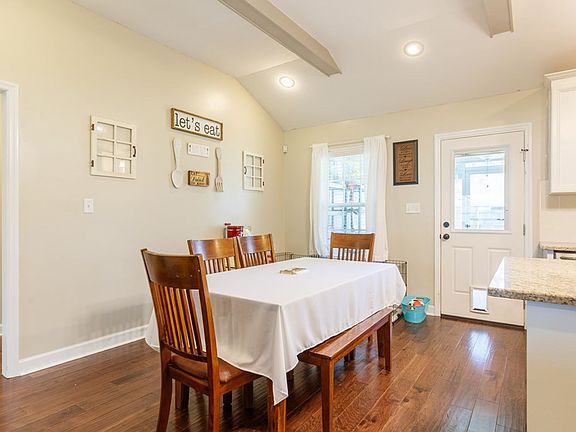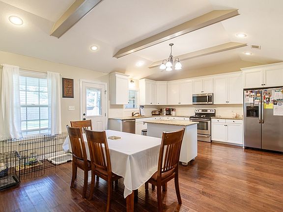 Step inside to discover an open, split floor plan featuring durable LVP flooring and a spacious living room with a tray coffered ceiling and ceiling fan. The kitchen is a true standout, offering modern white cabinetry, granite countertops, a stylish tile backsplash, and a large island that provides extra counter and storage space. Stainless steel appliancesincluding a stove, refrigerator, dishwasher, and microwaveadd to the sleek appeal, while vaulted ceilings with exposed beams and recessed lighting create an inviting atmosphere. The kitchen opens directly to the dining area, making it perfect for entertaining or everyday meals.