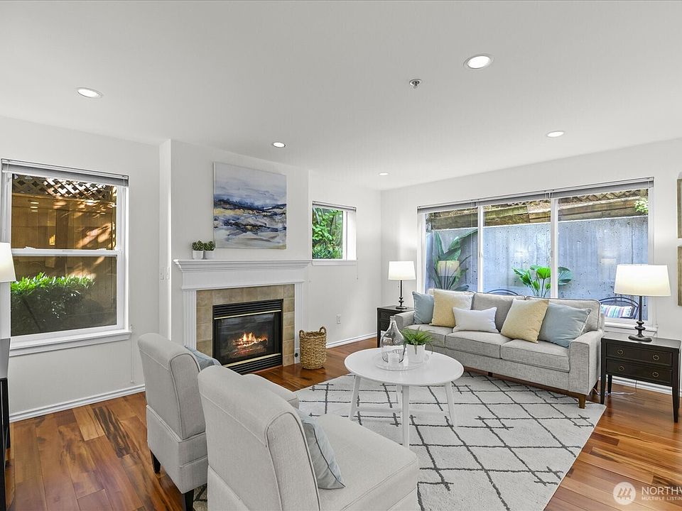 Attractive home in the heart of Greenwood! Spacious 2 bedroom / 2 bath floorplan for comfortable living, quietly tucked in the NE corner of the building, away from street activity. Ample-sized bedrooms including a primary with ensuite bath and walk-in closet. Brand new carpet and paint, ready for move-in. Warm-toned engineered hardwoods in the main areas, including a dining space. Gas fireplace makes it cozy! Stainless kitchen appliances and lots of kitchen cabinet space. In-unit laundry with extra room for storage. Private outdoor patio space right off the dining area. Dedicated, secure parking spot and additional secure storage on the main level. Fabulous location with transit, restaurants, pubs and Trader Joe's immediately nearby!