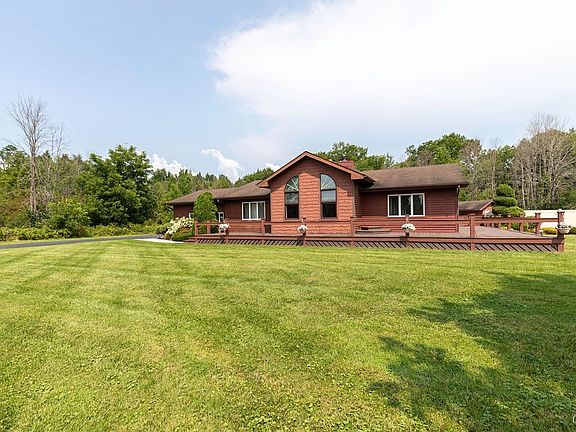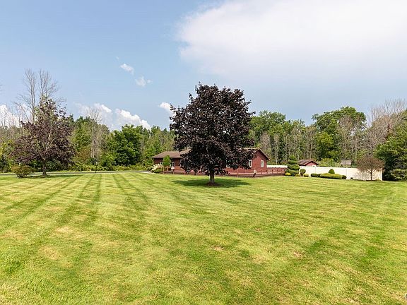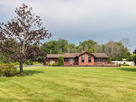 Unique Contemporary Ranch in a beautiful country setting overlooking a scenic golf course! Ideal location to main roads, NYS Thruway access, nearby amenities & entertainment. Situated on a deep, vast 1.72-acre lot w/an additional 1.11-acre lot (wooded w/creek) behind property included w/sale. Long double wide driveway & parking accommodates many guests. Fully fenced private backyard w/in-ground pool (diving board & slide), pool house w/half bath, playset, JennAir grill & expansive wrap-around deck/porch makes this the perfect venue for hosting parties & events. Front door entry opens to a spacious livingroom w/cathedral ceiling, see-through fireplace into dining room, hardwood floors & bright, natural light that bathes in through prominent windows. Kitchen w/stainless steel appliances & wine cooler, plenty of cabinet & countertop space & convenient garage entry. Main floor w/full bathroom, ample size bedrooms w/walk-in closets & primary bedroom w/ensuite bath. Full finished basement w/ceramic tile flooring has a recreation room w/bar, family room, bonus room, laundry room (washer/dryer included) w/half bath & 2 utility/storage rooms. Plus dual sump pumps & whole house generator.