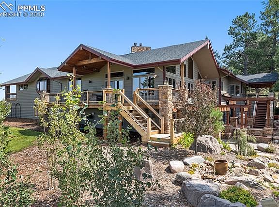 Quintessential Colorado Front Range Ranch! Rarely does an opportunity present itself to purchase a private yet close-in, move-in ready, one of a kind estate nestled on 153 treed and meadow acres with an expansive main residence, secondary guest house, barn w/ apartment, machine shop, multiple loafing sheds and sweeping views of the front range, Pikes Peak and Mt Evans. The ranch is minutes to I-25 and HWY 83, 15 minutes to Colorado Springs, 40 minutes to Denver. The main residence has been remodeled with high end finishes, impeccable craftsmanship and uncompromising attention to detail. Substantial outdoor living space including an enclosed courtyard with stacked stone fireplace and custom iron work by a local artist, flagstone patio and lush gardens, 5 decks with lighting & exposed timber beams. Gourmet kitchen with granite counters, hardwood floors, double sinks, Sub-Zero refrigerator, cherry cabinetry, Jenn Air convection double oven and a large butlers pantry. Luxurious master retreat w/ soaring vaulted tongue & groove wood ceilings, sitting area, private deck, walk-in closet, steam shower, dry sauna, tub, double vanity with marble counters. The sunken great room is perfect for entertaining and features gorgeous views of the front range, natural stone wood burning fireplace, vaulted ceilings, a wall of architectural windows with access to the large deck. Secondary main level suite w/ private deck, hardwood floors, built-ins and a large bath. Walk-out lower level with exercise room and a huge family room w/ wood ceilings, walk-out to patio, fireplace and stone surround. The guest home features 3 beds 2 baths. 11 stall barn w/auto water, gas heat, electric, concrete floors, tack room, water heater and laundry.
