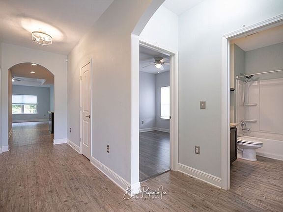 Walk-in corner pantryPrivacy fencesWall to wall carpetFenced-in backyardBlack appliancesSplit floor planWood laminate flooring
