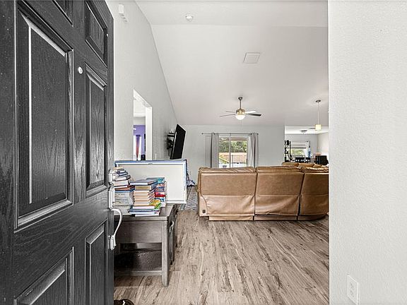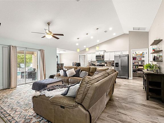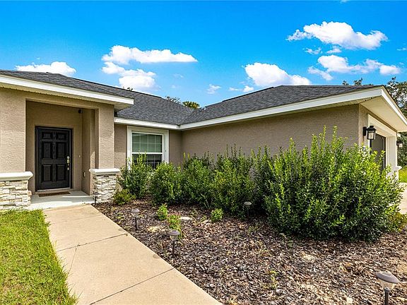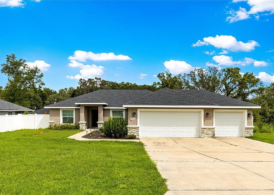 5000.00 DOLLAR PRICE IMPROVEMENT: Discover this beautifully designed contemporary pool home offering modern comfort and style. Featuring a spacious open split floor plan, this residence is perfect for both entertaining and everyday living. The thoughtfully planned layout separates the primary suite from the guest bedrooms for added privacy, while the open-concept living, dining, and kitchen areas flow seamlessly. Step outside to a covered patio and beautiful pavers that frames the sparkling pool—ideal for enjoying Florida’s sunny days or hosting evening gatherings. Pool also features a ledge for seating and lights. The backyard is fully fenced with vinyl fencing for privacy. The home also has an attached two-car garage with an additional golf cart space ensures ample room for vehicles, storage, and your golf adventures. Tucked away on a quiet dead-end street, this home provides a peaceful retreat while still being just minutes from The Villages,the VA clinic, as well as convenient shopping, dining, and entertainment options. Whether you’re seeking a permanent residence or a vacation retreat, this home offers a perfect blend of modern living, convenience, and resort-style relaxation. Close enough to take the golf cart to Publix.