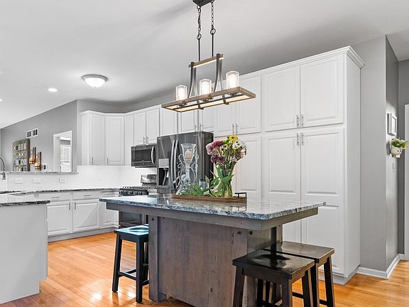 Enjoy maintenance free living in this beautifully upgraded townhome! This spacious open concept home offers 3 bedrooms- with a possible 4th bedroom! Check out the gorgeous updated kitchen featuring sleek white cabinets, granite countertops, black stainless appliances, and a custom made table with a matching granite top! Fall in love with the timeless hardwood flooring. The modern electric fireplace provides comfort and warmth in the heart of the home. This home provides an excellent floorplan! The main floor features the kitchen, living room, primary suite featuring an ensuite bathroom and walk-in closet, a 2nd bedroom, an additional full bathroom, and the laundry room. The finished daylight basement includes a generous bonus room, a 3rd bedroom with an ensuite bathroom and walk-in closet, a flex room offering the possibility of a 4th bedroom, and a dedicated storage area. Maintenance-free living with included lawn care and snow removal! The inviting neighborhood offers scenic walking paths, a park, and a beautiful lake with a fishing dock. All this just minutes from shopping, dining and major expressways. Don't miss your opportunity to own this gorgeous townhome!