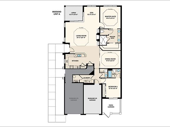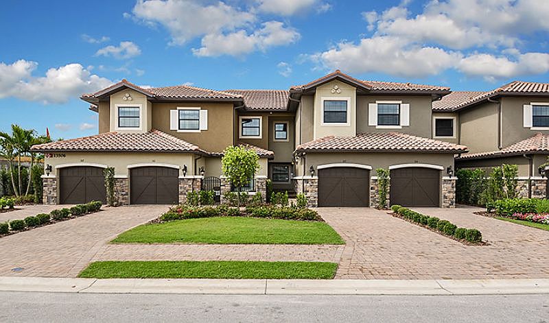 The Marano VII is a 1,956 sq. ft. ground floor one-story coach home with two bedrooms, two baths, a den, powder room and private lanai. The Master Suite includes dual sinks, corner shower and walk-in closet. The designer kitchen over looks a large living room and separate dining room. A laundry room and garage complete the home. Overlooking Golf course. Corner Unit.
