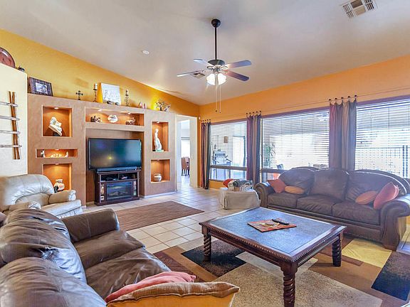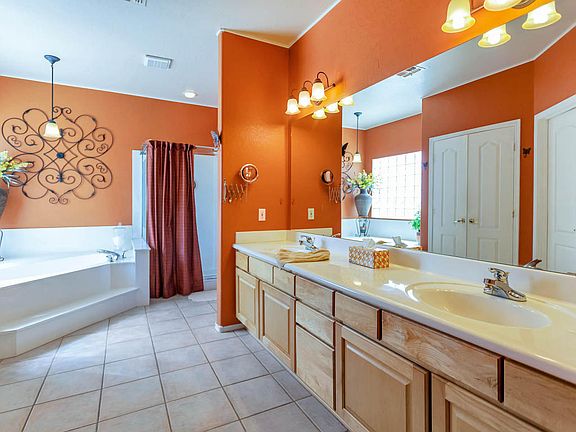 SINGLE STORY 3 CG POOL on a large lot in a beautiful lake subdivision...Vaulted ceiling, media niche, and tile in the living room. Kitchen with island, corian counters, smooth top electric stove, tile, reverse osmosis. Cabinets and sink in the laundry room. Double door entry in one bedroom, wood laminate flooring in all bedrooms, vaulted ceiling in the master and separate exit, walk in closet, double sinks and garden tub and glass block shower. Backyard includes large patio, bbq, & fireplace, fenced pebble tech pool, newer cartridge filter and variable speed pump. Solar lease, owned solar hot water heater, water softener, insulated attic. 3 car garage with separate exit.