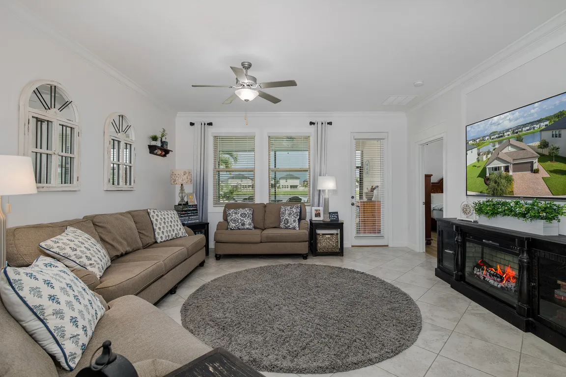 - Ceiling Fan(s), Crown Molding, Kitchen/Family Room Combo, Open Floorplan, Primary Bedroom Main Floor, Solid Wood Cabinets, Split Bedroom, Stone Counters, Thermostat, Tray Ceiling(s), Walk-In Closet(s)