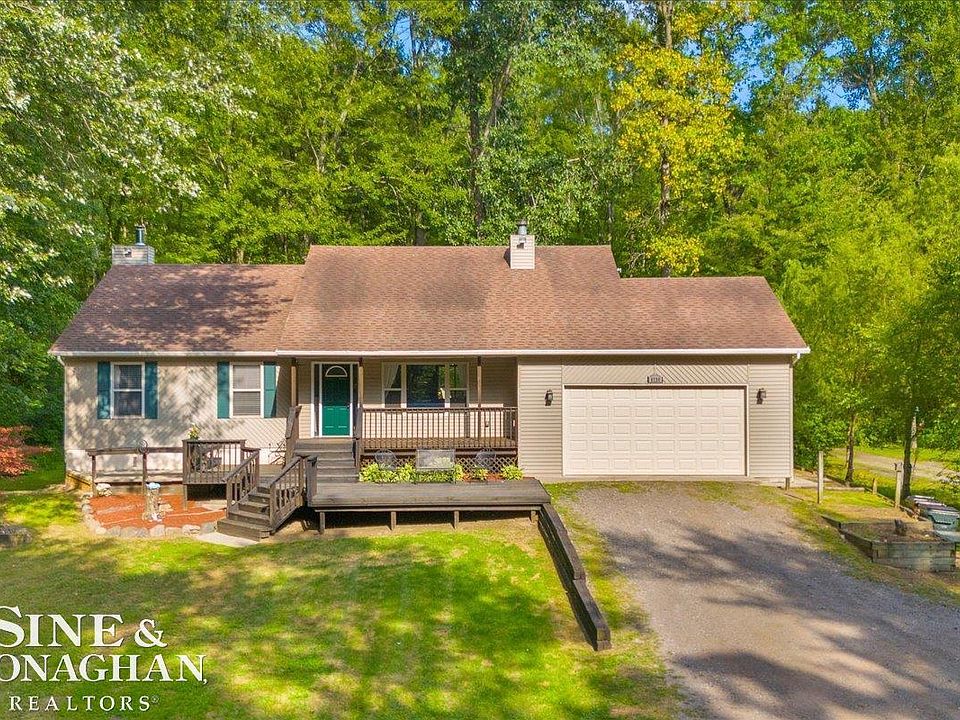 ESCAPE TO THE PEACE AND PRIVACY OF THIS BEAUTIFUL WOODED PROPERTY. THIS 4 BEDROOM, 3 BATH RANCH HOME IS NESTLED IN ON 3.25 ACRES OF MATURE TREES AND OFFERS 2600 SQFT OF COMFORTABLE LIVING SURROUNDED BY NATURE VIEWS IN EVERY DIRECTION. THIS IS THE IDEAL PLACE FOR OUTDOOR ENTHUSIASTS, HUNTERS, NATURE LOVERS, HOBBYISTS OR ANYONE SEEKING A PRIVATE RETREAT. ENJOY THE OPEN CONCEPT FLOOR PLAN FEATURING A GREAT ROOM WITH VAULTED CEILINGS AND A COZY NATURAL FIREPLACE. THE KITCHEN AND DINING ROOM COMBO FEATURE A BREAKFAST BAR AND A DOORWALL TO A BALCONY/DECK FOR ADDITIONAL OUTDOOR LIVING SPACE. THE PRIMARY BEDROOM FEATURES ITS OWN PRIVATE BALCONY/DECK. THE WALKOUT BASEMENT HAS BEAUTIFUL DAYLIGHT WINDOWS, A BEDROOM, FULL BATH, GAME ROOM, MEDIA ROOM, PLUS A WOOD STOVE INCLUDING A HEATILATOR VENTED TO THE MAIN FLOOR. 2.5 CAR ATTACHED GARAGE-SHED- CITY WATER- PAVED ROAD.