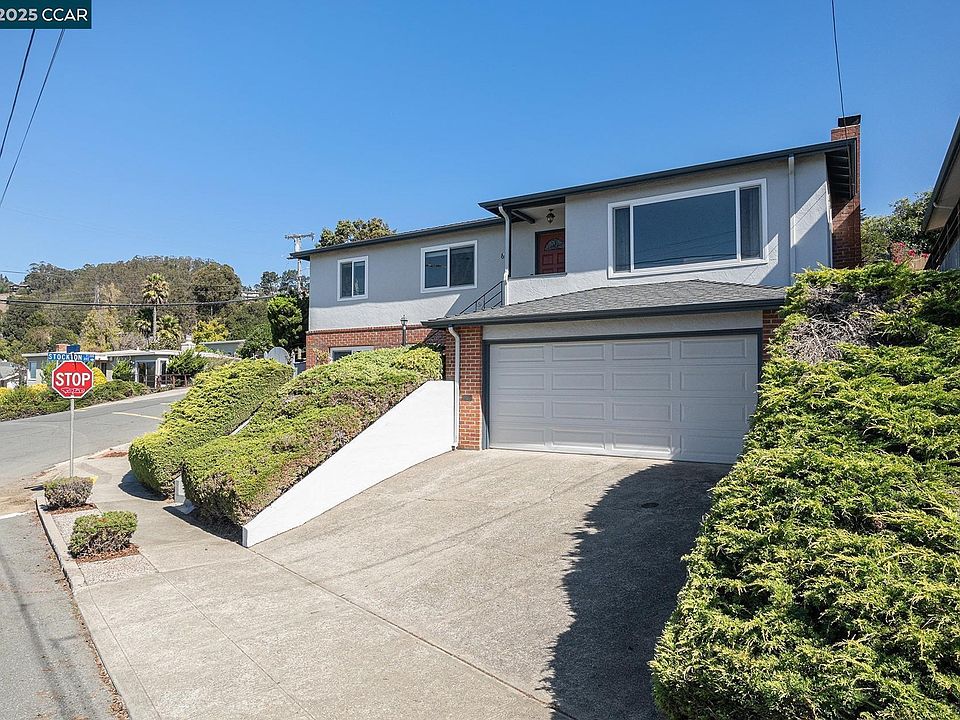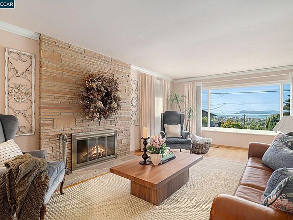 Lovingly maintained mid century home in El Cerrito Hills with SF Bay & Sunset Views from most rooms looking toward Golden Gate Bridge & Angel Island. Inviting & warm with sun filled rooms, gleaming hardwood floors and special decorator touches thruout in this 3 bedroom & 2.5 bath home. Entry foyer to living room with cozy fireplace & picture window views. Bright kitchen with birch finish cabinets, recessed lighting and breakfast bar. Open to dining room area with door to secluded rear yard. Lower level of home features oversized family/gathering room, complete with wet bar, custom wine storage area, laminate flooring & guest powder room. Low maintenance landscaping front & back for easy care living. Rear yard with patios, terraced rose garden and deck area to enjoy morning tea or evening sunsets. Conveniently located minutes to several shopping areas, BART Stations, many tasty restaurants, neighborhood cafes and various recreation areas including SF Bay Trail. YOU WILL LOVE LIVING HERE !!!