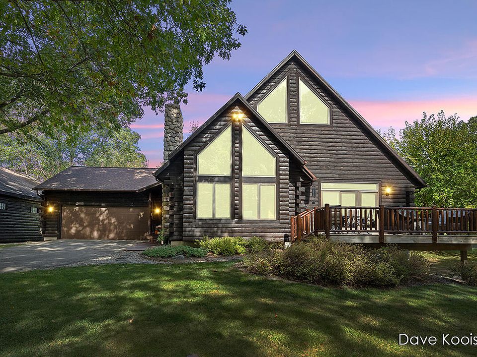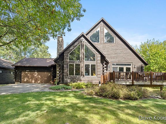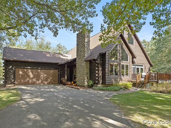 Less than 5 minutes from downtown Ada sits this remarkable custom-built log home on almost four private acres, and only 10 minutes from downtown Grand Rapids. Built with extremely high-quality construction, the craftsmanship of this home is sure to impress. The stunning living and dining areas feature 27-foot cathedral cedar ceilings with massive log beams that fully expand the open space plus a wood burning fireplace insert with a fan that can heat most of the main floor. The spacious kitchen includes a large snack bar, walk-in pantry, abundant custom-built cabinetry, and all stainless steel appliances. The main floor also offers bedrooms 2 and 3, along with a full bathroom featuring double sinks and new granite countertops. A unique custom log stairway leads to the luxurious master suite, complete with a wood-burning stove, sliding glass doors to a private deck, jacuzzi tub, dual sinks, walk-in tiled shower, generous closet space, and a loft overlooking the main level. The daylight basement is framed and ready for a recreation room with a wood-burning fireplace, additional bedrooms, and is plumbed for a full bathroom. It also includes a laundry area and ample storage. Additional updates include a brand-new roof, Anderson windows throughout, refinished hardwood floors, new tankless hot water heater, wired for a generator, and a freshly stained exterior. A major highlight is the 30x44 pole barn, finished with matching log siding. All of this is situated on a secluded 3.7-acre lot with picturesque views, yet part of a private subdivision of 18 homes on a quiet road. Don't miss this one-of-a-kind homeyou'll fall in love with its character and charm. Come see it today!