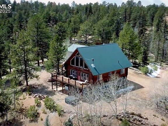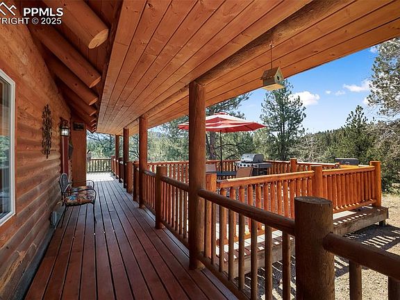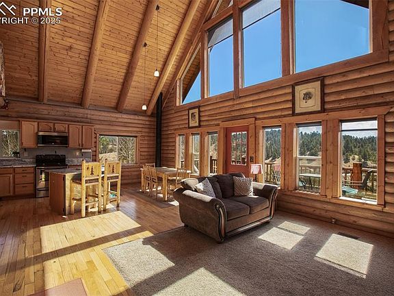 Located on 2 picturesque acres filled with a beautiful mix of pine and aspen trees, this spacious 3-bedroom, 3 bath log home offers the perfect blend of rustic charm and modern comfort. Conveniently located just 45 minutes from Colorado Springs and minutes from local grocery stores, you’ll enjoy the serenity of mountain living without sacrificing convenience. Step inside to a warm and inviting open floor plan featuring thoughtful upgrades throughout. The generous living space is perfect for entertaining or relaxing after a day exploring the outdoors. Large windows frame breathtaking views of iconic Pikes Peak, bringing the beauty of Colorado right into your living room. Step into the lower-level walkout and discover the perfect blend of comfort and relaxation. This spacious area features new carpet throughout, a cozy wood-burning fireplace, and a private room that is ideal for guests, a home office, or multi-generational living. Walk right out onto the patio, where you'll be greeted by incredible Colorado’s beautiful sunsets and mountain vistas. Whether you're entertaining or enjoying a quiet evening, this lower level is designed for both comfort and connection to nature. Enjoy the peace of mind and durability of a metal roof, a 3-car garage for all your vehicles and toys, and ample parking space for guests or an RV. There are perks to this amazing location and having easy access to Hwy 24 - you are first in line for plowing, to first responders if needed, close to Florissant for groceries, the library and post office! Jump on 24 & you're just a scenic drive away from world-class ski resorts and endless outdoor recreation. Whether you’re looking for a year-round residence or a peaceful mountain getaway, this well-maintained home checks all the boxes. Check out the 360 virtual tour!