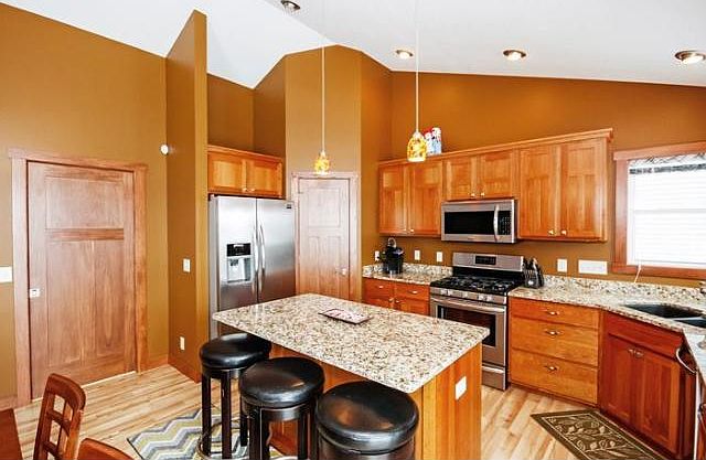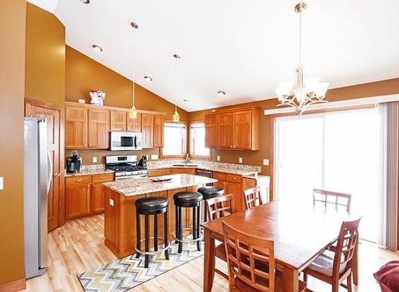 NO REASON TO BUILD!! Move right into this 2014 built, walkout rambler, located close to the River Falls Golf Course. Features include; 3 bedrooms, 2 bathrooms, including master, Cherry cabinets & built-in book shelf, granite countertops, stainless steel appliances, walk-in closet & pantry, laminate & tile floors, center island, Silverline vinyl windows by Andersen, 3 panel solid doors, vaulted ceilings, central air, main floor laundry, deck, patio, no steps at either entrance & 1423 finished square feet on the main level. Put your touches on the lower level which has rough-in for bath & egress windows. THIS IS A VERY NICE FIND!!