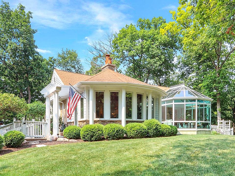 Stately 4+ bedroom, 3 bath hilltop home on over an acre in Country Club Estates. Delightful great room with fireplace and wood floors, modern kitchen with granite counters, stainless appliances and Viking range. A year-round heated sunroom was just added last year. Attractive primary suite with access to a beautiful, fenced garden and patio. Sun-filled family room, main floor laundry, lower-level media room with wet bar and wine fridge, game room, office/den or 5th bedroom, and very impressive wine cellar. Wraparound deck with permanent and retractable awnings, private backyard patio with fire pit. 2+ car heated garage, irrigation system, security system, and generator. Dockominium Boat Slip at the Abbey Harbor and Yacht Club membership included, you'll enjoy the pool, clubhouse, and bar.