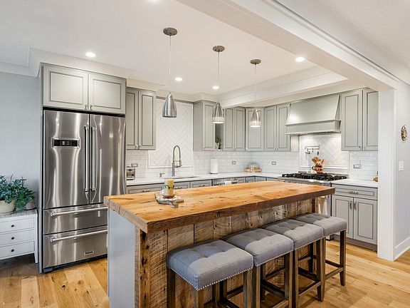 Gas fireplaceReclaimed wood island countertopWelcoming foyerOpen-concept kitchenPantry with custom-built shelvesQuartz countertopsCeramic backsplash