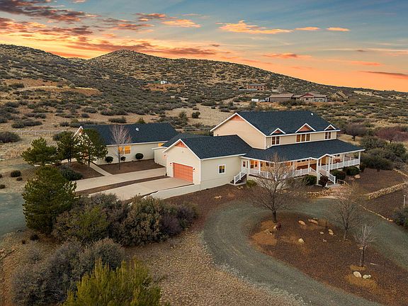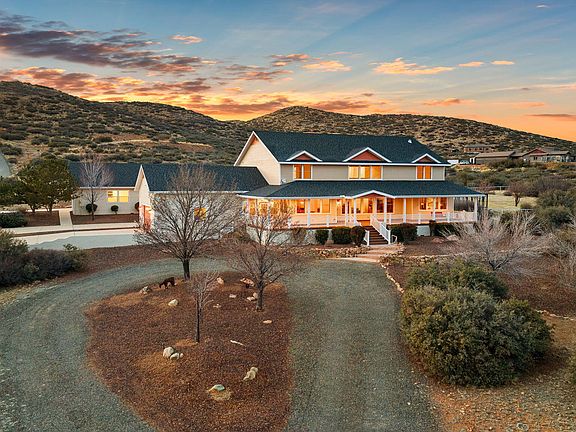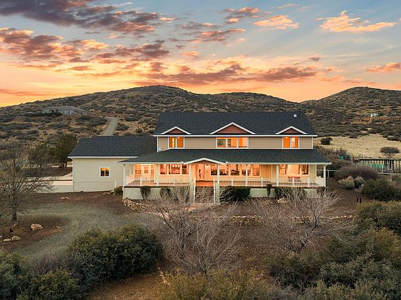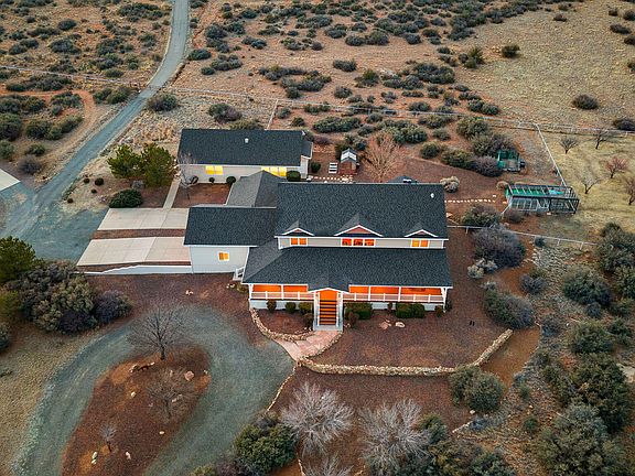 Set against six pristine acres with sweeping, unobstructed views of Mingus Mountain, this extraordinary 5,202 sqft estate captures the essence of refined Northern Arizona living. Privately gated and thoughtfully positioned to maximize both privacy and panoramic scenery, the property offers a rare combination of architectural significance, craftsmanship, and serenity. From the moment you arrive, the presence of the home is undeniable. A majestic wraparound porch frames the residence, creating multiple vantage points to take in dramatic sunsets, rolling high-desert terrain, and cool mountain breezes. It's the kind of setting that immediately shifts the pace. Where mornings begin with quiet coffee overlooking the peaks and evenings are reserved for entertaining under expansive Arizona skies. Inside, soaring high-beam ceilings and walls of oversized windows flood the interiors with natural light while perfectly capturing the surrounding landscape. Magnificent architectural lines, elevated ceiling details, and carefully curated finishes create a sense of understated luxury throughout. Every element reflects meticulous attention to detailfrom the high-end custom cabinetry and premium flooring to the thoughtfully designed living spaces that balance grandeur with warmth. The chef's kitchen serves as both a functional showpiece and gathering space, featuring custom millwork, upscale appliances, generous prep areas, and seamless flow into formal and informal living areas. With five spacious bedrooms and four well-appointed baths, the layout offers flexibility for hosting guests, multi-generational living, or creating dedicated office and retreat spaces. Outdoors, the estate truly shines. A fully equipped outdoor kitchen invites effortless entertaining, whether hosting intimate dinners or larger gatherings beneath star-filled skies. The acreage provides both privacy and usability, ideal for those who value space, tranquility, and the freedom that only a property of this scale can offer. For automotive enthusiasts, collectors, or hobbyists, the attached four-car garage is complemented by an impressive eight-car detached garage/workshop. An exceptional amenity rarely found in residential estates. Whether housing a collection, recreational vehicles, or serving as a creative workspace, the possibilities are extensive. Serviced by private well and septic, the property offers both independence and long-term sustainability. Located within comfortable reach of city conveniences while delivering a noticeably cooler climate and elevated lifestyle, this estate presents a compelling opportunity for those seeking a refined primary residence or an exceptional retreat away from the heat and intensity of the valley below. Unparalleled in beauty, scale, and craftsmanship, this is more than a home, it is a legacy property offering extraordinary views, architectural presence, and the privacy discerning buyers.