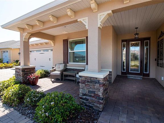 Stunning Argyll model home located on PREMIUM GOLF COURSE LOT in Stonebridge neighborhood of Candler Hills 55+ gated golf community. This tastefully decorated home has 3 bedrooms & 3 baths (two master suites), and a 3-stall oversized garage! Upgrades include: crown molding, tray ceilings, convection wall oven microwave combo, Quartz countertops kitchen & baths, LED lighting package above and under cabinets, painted & glazed staggered kitchen cabinets, ultra-quiet dishwasher, deluxe owner's entry w/wine bar & cooler, upgraded Delta faucets, walk-in showers with upgraded tile finishes, 18" ceramic tile floors throughout, carpet in bedrooms, custom plantation shutters in the rear of the home, laundry room storage cabinets w/quartz countertops & laundry sink, paver driveway and walk, power rollup screens both garage doors, Quiet cool whole house fan installed in garage for ventilation, garage ceiling storage racks, private 12 x 20 rear paver patio just outside the very private lanai, full perimeter landscaping package, and much, much more. Current New Home Warranty is transferable. WASHER/DRYER, GARAGE REFRIGERATOR AND STAND ALONE FREEZER, AND WORKBENCH BOTTOM CABINETS & COUNTERS DO NOT CONVEY.