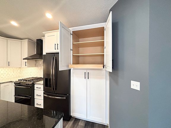 Center islandLvp flooringVaulted ceilingsBlack slate appliancesWhite cabinetsRambler with finished basementDining room