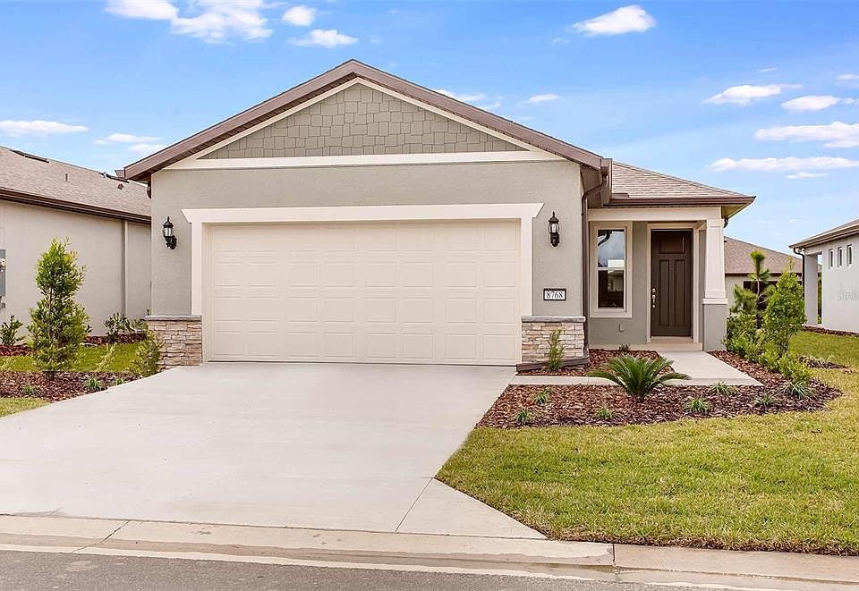 One or more photo(s) has been virtually staged. Move-In Ready Home Available NOW! Enjoy all the benefits of a new construction home in the serene setting of Ocala, FL's horse country, with an age-restricted, fully amenitized lifestyle at Del Webb Stone Creek. This is the active adult community you've been looking for, with amenities that include an 18-hole championship golf course, a full restaurant and bar, indoor and outdoor pools, sports courts, and so much more. Our sprawling amenities, clubs, and classes will fill your retirement days with activities to make new friends and memories. The 2-bedroom, 2-bath Compass home design has the space you need, designed with privacy, convenience, and versatility in mind. This light-filled open floor plan features a designer kitchen, luxury finishes, and a covered lanai. The kitchen has a large island, a single bowl sink, and stainless steel appliances including a range, microwave, and dishwasher. The kitchen and baths have sarsaparilla cabinets and quartz countertops. There’s also a walk-in shower with a bench seat and dual sinks in the Owner’s Bath. The Owner’s suite is at the rear of the home for privacy and has a large walk-in closet. There is 22”x22” floor tile in the main living areas, bathrooms, and laundry room and stain-resistant carpet in the bedrooms. Additional features and upgrades include a versatile flex room, 2-car garage with a 4’ extension and utility sink, and a Smart Home technology package with a video doorbell. Call or visit today and ask about our limited-time incentives and special financing offers!
