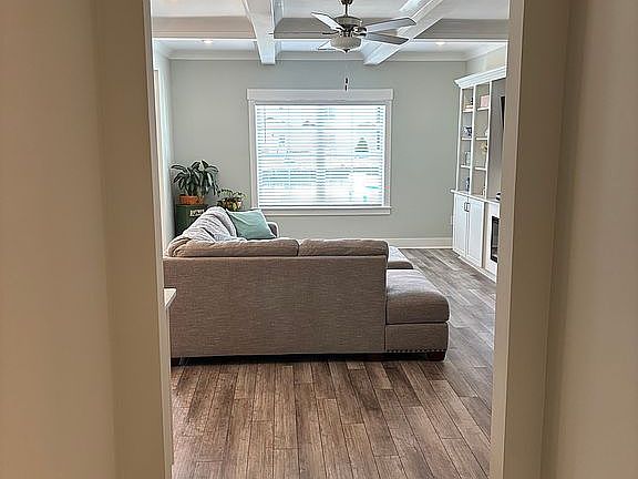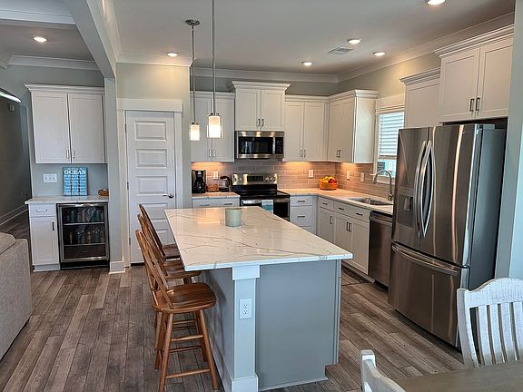 Step inside to find a bright, open floor plan featuring luxury vinyl plank (LVP) flooring, Craftsman-style trim, and crown molding throughout. The heart of the home is the stunning kitchen, complete with upgraded stainless steel appliances including a double oven, sleek quartz countertops, and a dry bar with a built-in beverage cooler—perfect for entertaining.